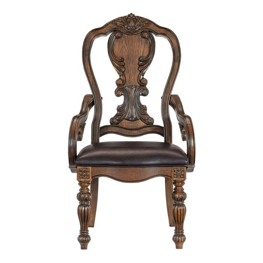 The grand scale of the Bergen Collection invokes a timeless aesthetic for your home’s traditional dining room. The armchair’s dark oak finish h...