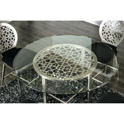 This airy dining set from the Abner Collection is a breath of fresh air. Featuring a metal base in a satin-plated finish and a round, tempered-glass table top, this dining table will turn any cramped room into a spacious gathering area. The contrast and comfort of the black, padded dining chairs gives this set just the right amount of inviting stability.