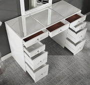 The Louise Vanity has both everything you need to get ready for the day and versatile storage for keeping your space tidy and organized. Neutral upholstery and smart white finish works well with existing decor. The set features multiple drawers, a mirror with integrated LED lighting, and an included stool with padded seat.