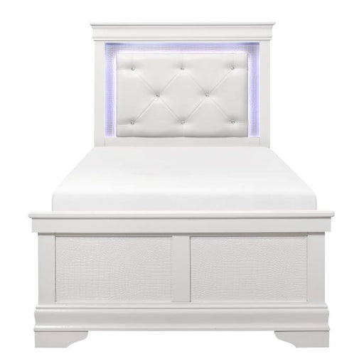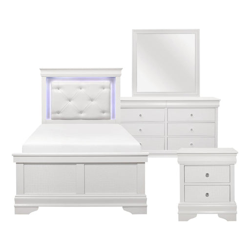 The unexpected intersection of traditional design and glamorous styling creates a dynamic look perfect for your bedroom. A white finish utilized to enhance the faux alligator embossed fronts of the bed and coordinating case pieces. The headboard features a faux leather crystal-tufted headboard as well as dramatic LED backlighting. Crystal faceted knob hardware fronts each alligator embossed drawer front. The nightstand, dresser, and chest each feature hidden storage allowing for the discrete placement of your personal affects.