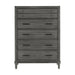 Modern convenience is paired with transitional style to create the versatile look of the Wittenberry Collection. The chest’s gray finish over okume veneer is complemented by the dark bronze finished knob and bar hardware that fronts the framed drawers of the piece. 38 x 19 x 52.5H