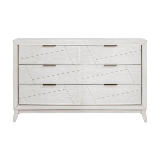 This contemporary six-drawer dresser is designed with clean lines and a light elm finish to complement modern spaces. Brushed nickel fingertip pull...