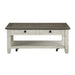 Inspired by the aesthetic of a casual country home and providing functional decorative accent for your living room is the occasional table set of the Granby Collection. The two-tone look of the acacia and pine solids base, finished in antique white, and the oak veneer of the cocktail table’s rosy brown-finished top, presents as a harmonious combination of color, perfect for your home. Dark finished metal knob hardware fronts the functional drawers of the cocktail table while providing subtle contrast to the finish of the collection. An open display shelf creates a perfect spot for display of your decorative accessories, while casters allow for ease of movement of the cocktail table within your space. 48 x 26 x 20H