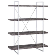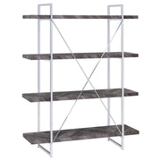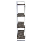 Enhance your storage and display space with this contemporary bookshelf, featuring a rustic grey herringbone finish for a modern organic touch. The sleek chrome metal frame provides durability and style, complemented by an X-shaped back support for stability. Four open shelves extend beyond the frame, creating a bold, geometric aesthetic perfect for showcasing books, décor, or collectibles. Crafted from engineered wood and metal, this shelving unit blends industrial and modern styles seamlessly, making it a stunning addition to living rooms, offices, or bedrooms. Key Features: • Four-tier bookshelf with a bold open-shelf design for a modern look • Rustic grey herringbone finish adds warmth and organic charm • Sleek chrome metal frame with X-back support enhances durability • Extended open shelves provide ample display space for books and décor • Crafted from engineered wood, MDF, and metal for long-lasting use • Ideal for home offices, living rooms, or contemporary spaces
