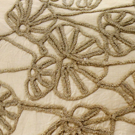 This square pillow features intricate floral patterns in subdued shades of green and brown on an ivory backdrop.