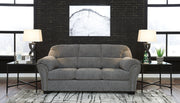 Why sacrifice comfort for style (or style for comfort) when you can have the best of both in this sofa in pewter gray. Elements include a chic divided-back design and pillow top wrapped armrests that make nodding off all too easy. Calling attention to the elegantly flared armrests—black nickel-tone nailhead trim for a punch of cool character.