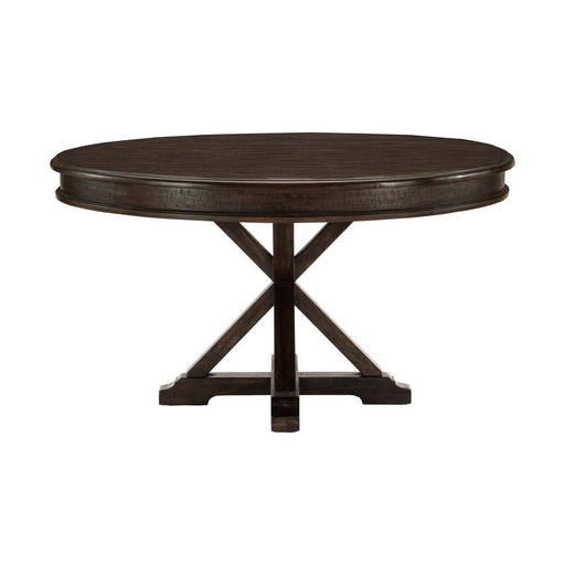 The solid transitional styling of the Cardano Collection creates an impactful design presence in your dining room. Utilizing distinct accent techniques – plank effect, rasping, saw marks – and pairing them with traditional framing and a rich finish – driftwood charcoal over acacia veneers – creates a collection that is worthy of your dining room. 54-inch round pedestal base table allows for perfect placement within your space. Pewter-finished hardware mounted on the functional drawers and doors of the china and server provides a subtle contrast to the wood’s dark finish. The behind glass door shelving of china top allows for convenient and unobscured access to your decorative tabletop accessories, while the buffet server, with its wood door and drawers, serves dual purpose as the china’s base and as a stand-alone sideboard.