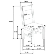 Crafted to welcome connection, this dining set invites you to gather, linger, and share life around the table. The rich vineyard oak finish enhances every grain with warmth, while the solid rubberwood frames offer grounded durability. With its sturdy draw leaf extension table and matching ladder-back seating, each piece balances rustic simplicity with timeless design. Whether it's everyday meals or festive moments, this set holds space for them all. Key Features: • Five-piece dining set includes extension table and four matching side chairs • Table extends from 62.75 to 86.5 inches with two 12-inch draw leaf extensions • Vineyard oak finish enhances rustic grain and natural wood character • Chairs feature tall ladder backs and sturdy stretchers for lasting support • Crafted from solid rubberwood for strength, weight, and enduring quality • Perfect for everyday meals or gatherings in farmhouse and transitional spaces