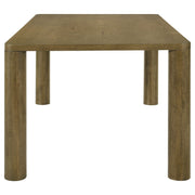 Upgrade to the inviting ambiance of this modern wooden dining set that includes a rectangular table and side chairs. It creates a warm and welcoming ambiance in your dining room, featuring a brown oak wood grain finish that pairs beautifully with light tan upholstery. Chairs feature foam cushions and a robust wood base design, augmented with tapering legs that provide ample support. The rectangular dining table features round column legs with rounded corners to create a seamless, cohesive look and feel. Choose a stylish centerpiece or lovely linens to complete the look. Key Features: • Simple and inviting, this modern wood five-piece dining set features a rectangular silhouette • Table features four round column legs for robust support and a touch of fluidity and movement • A brown oak finish over rubberwood creates a warm, natural look and feel at your table • Chairs feature a rounded back with a robust base with a matching curve and tapered legs for support • Light tan upholstery over foam complements the seat and back, offering superb comfort and support