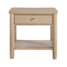 Add a touch of rustic charm and practical storage to your living space with this acacia wood end table. Crafted from acacia veneer, solid wood, and engineered wood, this table features a beautiful wire-brushed power glaze natural finish that highlights the wood's natural grain. It offers convenient storage with a smooth-gliding dovetail drawer for organizing essentials and a bottom open shelf for displaying décor or storing books. The polished chrome tone knob adds a touch of elegance, complementing the table's warm and inviting aesthetic. This versatile piece combines functionality with rustic charm, making it a perfect addition to any living room or bedroom.