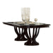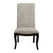 Sophisticated soft contemporary design is achieved in your dining room with the addition of the Savion Collection. Rectangular double pedestal table featuring a distinct birdcage style base. An espresso finish highlights the unique veneer pattern. Dramatic flair is lent to the design by the accompanying chairs. Neutral tone fabric covers the substantially sized roll back arm and side chairs. Reeded fronts on the server along with the serpentine profile further the elegance of this distinctly sophisticated collection.